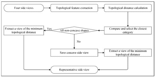 In this method, after projection, each model obtained one top view and four side views. The feature vectors of the side views were compared with the pre-value (as show in Figure 8) and the category that best matched was selected as the determination result. If all four side views were non-concave images, the non-concave image closest to the pre-value among the side views was chosen as the representative view of the side view; if not all of them were non-concave images, the view closest to pre-value was chosen as the representative view among the concave side views. This is reasonable because, during the projection process, models with concave structures can still yield non-concave structure views at specific angles, whereas the reverse is not true, and as long as other topologies are found in the views, the model can be determined to have this structure. The specific process is shown in Figure 9. After obtaining representative side views, the QDAH of the top and side view were sequentially combined to obtain the feature vectors of the model. Finally, the similarity was calculated using Euclidean distance and sorted to obtain the final retrieval result.