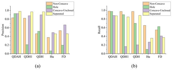 From Figure 10, the following results can be drawn: Firstly, the improvement in the voting interval of QDH significantly improved the precision of the non-concave images, but after stripping the non-concave images accurately, many concave unclosed images initially classified as non-concave were included in the category of hole images, which led to a significant reduction in the precision of the class of holes in the presence of the increase in the recall rate of the category of holes. Secondly, the inclusion of the angle distribution feature significantly improved the differentiation between concave unclosed images and hole images, thus achieving a more desirable classification of the four categories of topologies. Lastly, the QDAH algorithm outperformed other algorithms in this dataset.