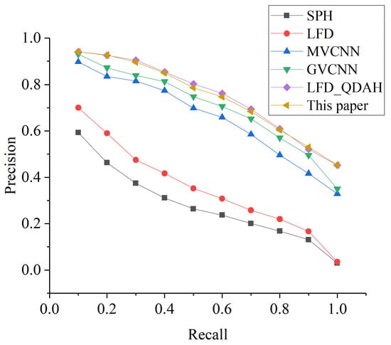 In order to verify the retrieval performance of the algorithm, the proposed algorithm was compared with the spherical harmonics descriptor (SPH) [], LightField descriptor (LFD) [], multi-view CNN retrieval algorithm (MVCNN) [], group-view CNN retrieval algorithm (GVCNN) [], and projective approach of LFD combined with the QDAH feature descriptor (LFD_QDAH). The P-R curve refers to the relationship curve between the precision rate and recall rate, which is a common method for evaluating the performance of information retrieval systems, text categorization systems, and so on. In the P-R curve, the horizontal axis is generally the recall rate and the vertical axis is the precision rate. To objectively assess the algorithm’s retrieval performance, this paper plotted the P-R curves of each algorithm, as shown in Figure 11.
