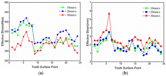 Under the condition of not changing other process parameters, three different forging striking speeds, namely 10 mm/s, 20 mm/s and 30 mm/s, were selected to analyze the effective strain and effective stress at each reference point of the forging workpiece, and the variation curve is shown in Figure 11.