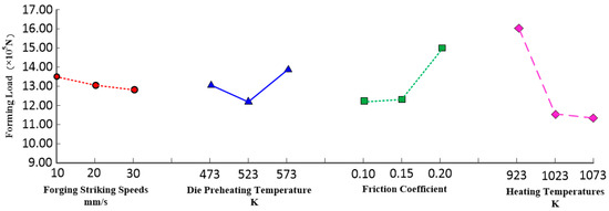 The experiment results and data analysis are shown in Table 5. R is used to represent the range at the level i (i = 1, 2, 3). The degree of influence of the parameter on the forging–forming load can be seen from the size of the range, R. The larger the range (R) is, the greater the influence of the parameter on the forming force is, and the parameter is the main influence factor. The smaller the range (R) is, the smaller the influence of the parameter on the forming force is, and the parameter is the secondary influence factor. According to the value of the range, R, in Table 5, it can be seen that the influence of each process parameter on the forging–forming force is D, C, B and A, from the largest to the smallest.