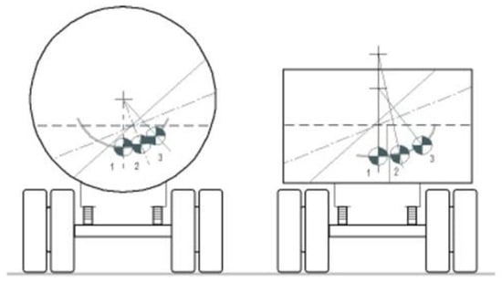From the dependencies presented in the formulas, it can be seen that, in order to increase the stability of the vehicle, it is necessary to reduce the height of the vehicle’s center of gravity and/or to increase the length of the track [25].
