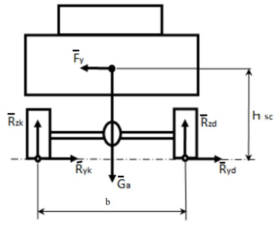 where: rm—turning radius, m; g—acceleration of free fall, m/s2; β—the angle of inclination of the transverse road; hsc—the height of the vehicle’s center of mass (Figure 2), m; b—the width of the vehicle’s wheelbase, m.