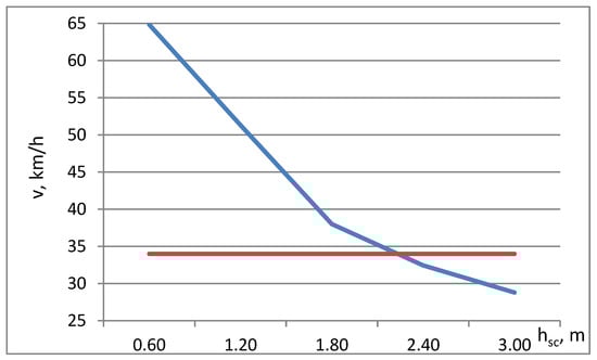 The vehicles used for the investigation include a dump truck designed for moving large quantities of bulk freight, as well as a tank truck specifically designed for transporting liquid cargo. The trucks’ technical specifications, categorized by type and model, include the following: mass of 20,500 kg and 23,540 kg, respectively, height of the center of mass of 1.624 m and 1.741 m, respectively, and track width of 2.174 m and 2.04 m, respectively. Dynamic stability calculations were conducted to ascertain the threshold speed at which the vehicle would maintain balance and prevent both overturning and sliding. Figure 4 depicts a graphical depiction of the truck’s roll and slide in relation to the driving speed and center of gravity. The vertical location of the center of gravity was adjusted within the range of 0.60–3.00 m, with increments of 0.6 m, as seen in Figure 4.