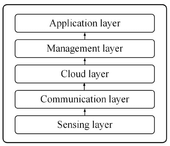Despite implementations in various fields, the IoT has its base architecture, although it is yet to be standardized. However, the base architecture is derived based on the process similarity among the IoT system implementations [4]. Considering the existing systems, IoT architecture can be divided into five main layers: sensing, communication, cloud, management, and applications layers [11]. As aforementioned, knowledge or data is gained through sensing devices. Therefore, the sensing layer can be regarded as the first layer in the IoT architecture. This layer consists of sensor networks and embedded technologies, also considered the slowest layer compared to other layers [12]. Above the sensing layer is the communication layer, and its task is to bridge and manage the communication between the sensing and upper layers. These layers include routers, switches, and other similar devices and use several protocols such as CoAP [13] and Message Queueing Telemetry Transportation (MQTT) [14]. The cloud layer is the one-level layer above the communication layer and as the name implies, the cloud layer utilizes cloud and edge computing technologies. In the cloud layer, data are processed and analyzed to obtain more insights, and information and decision-making can be performed [15]. Cloud technologies are currently equipped with artificial intelligence technologies to enable autonomous decision-making [16]. The management layer is responsible for monitoring other layers so that actions can be taken if faults or errors occur on those other layers. Finally, the application layer can interact with end-users directly. It provides applications and services for end-users so that all processes in the IoT can be operated within human control [11]. As illustrated in Figure 1, this architecture forms the foundation for diverse IoT implementations, providing a flexible yet structured framework for various IoT applications.