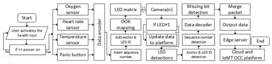 Figure 3 shows the block diagram of the IoMT OCC form, and the process begins when the patient activates the health device. This process involves collecting data from oxygen, heart rate, and temperature sensors, which are vital indicators in health monitoring and are equipped with a panic button. A data encoder then encrypts the data collected by these sensors. This encrypted data is then transmitted through a matrix of LEDs using the On-Off Keying (OOK) modulation technique. Each LED has its own identity and acts as an anchor in data communication, allowing the identification of specific LED locations and ensuring the accuracy of the received data source.