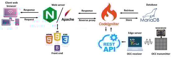 The OCC-IoMT platform facilitates the transmission of health data from IoMT devices through optical signals to a camera, where the data are then analyzed and stored in the cloud, easing access and data management. Patients can register and create a “channel” that allows them to organize data, perform analysis, and provide intuitive data visualization, thus supporting real-time monitoring of patient health conditions. Based on the application architecture of the OCC-IoMT platform, as depicted in Figure 5, the transmitter part, the MAX30102 sensor, collects vital patient data such as oxygen saturation, heart rate, and body temperature. as well as the panic button value. These data are processed and converted into signals suitable for transmission through an LED matrix. This process uses OOK modulation, in which the data is encoded into light patterns that can be transmitted. On the receiver side, the edge server acts as a point of collection and data processing. This server receives the light signals captured through a camera or optical sensor and converts these signals back into digital data. Subsequently, the processed data are sent to the backend system via a REST API built using CodeIgniter. This API manages data interaction between the edge server and the main database. The data are then stored in a MariaDB database. On the client side, a web application enables patients to access data through a browser. The web server, running on Nginx and Apache, handles requests and responses between patients and the server. CodeIgniter is also used to manage data interaction between the web server and the database.