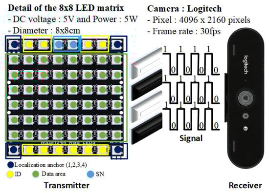 - Salvi, S.; Geetha, V. LiCamIoT: An 8 × 8 LED Matrix Pattern to Camera Communication for LiFi-IoT Applications. In Proceedings of the 2022 IEEE Silchar Subsection Conference (SILCON), Silchar, India, 4–6 November 2022. [Google Scholar]