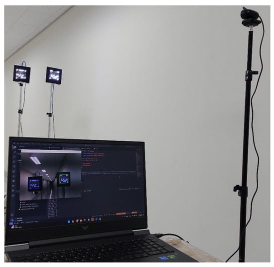 In the testbed setup, the mentioned sensors are employed, and the data produced will be modulated and mapped to the OCC LED 8 × 8 matrix as the transmitter. Arduino UNO is used as an intermediary device to connect the LED matrix transmitter and the sensors. Two webcams resembling the security camera (CCTV) in the building are used as OCC receivers. The LED utilized has 8 × 8 LEDs and will accommodate the localization anchor, SN, and health monitoring data. The overall process on the receiver side with the sample image is shown in Figure 7. Two webcams were used in this study, using the Brio UHD Pro Camera, manufactured by Logitech International S.A. in Lausanne, Switzerland, on the receiver side. Both LEDs are programmed using C++ for Arduino, while the receiver camera is controlled using Python version 3.11.