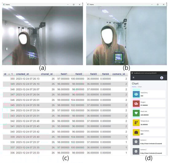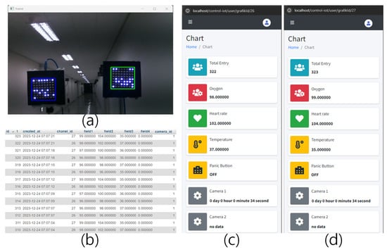 The results of implementing the OCC-IoMT system. (a) The detection performed by the YOLO algorithm, depicting how the system can accurately identify and monitor two patients simultaneously; (b) the database containing data received from both patients; (c,d) the patient-accessible web interface (the first scenario).