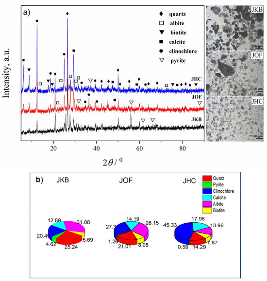 (a) XRD patterns of JKB, JOF and JHC samples of fraction −10 + 0 µm; (b) Estimated mass percentages for the mineral composition of JKB, JOF and JHC samples.