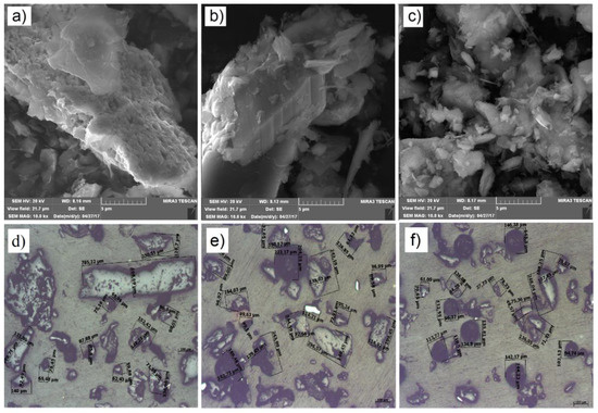 SEM images of the: (a) JKB, (b) JOF, (c) JHC, (d) JKB, (e) JOF and (f) JHC; (d–f) with the particle size obtained by optical microscopy.