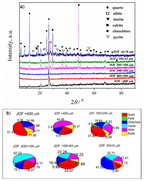 From Figure 5, it is evident that after fractionization of the JOF sample, the content of detected mineral phases significantly changed. The composition of individual fractions differs from the others. From Figure 5b, it is clear that the content of calcite increases for lower particle size in comparison with the starting JOF sample. For the fractions −63 + 0 µm and −100 + 63 µm, the calcite content was ~22%, and maximal calcite content was obtained in the fraction −200 + 100 µm (~52%). In other fractions (+200 µm), the content of the calcite was much lower, in the range ~1–6%. The content of albite in all fractions in the range −400 + 0 µm was lower in comparison with the starting sample (Figure 2b, 28.15%) and only in fraction +400 µm was a significantly higher amount of this mineral detected (~45%). The samples with a particle size of −300 + 0 µm contained smaller amounts of biotite than the starting sample (maximal 7.71%). In fractions with a particle size of +200 µm, significantly larger quantities of this mineral were detected (~12% for the fraction −400 + 300 µm and ~15% for the fraction +400 µm). The quartz content varied in the range of 10–50%, while that of pyrite to a maximum of 5%, and the clinochlore content varied in the range of 13 to 42%. Considering the results presented in Table 5, the most prevalent are fractions −300 + 200, −200 + 100, −100 + 63 and −63 + 0 µm (in total 92%), and the extraction of useful minerals will be cost-effective only from these three fractions.