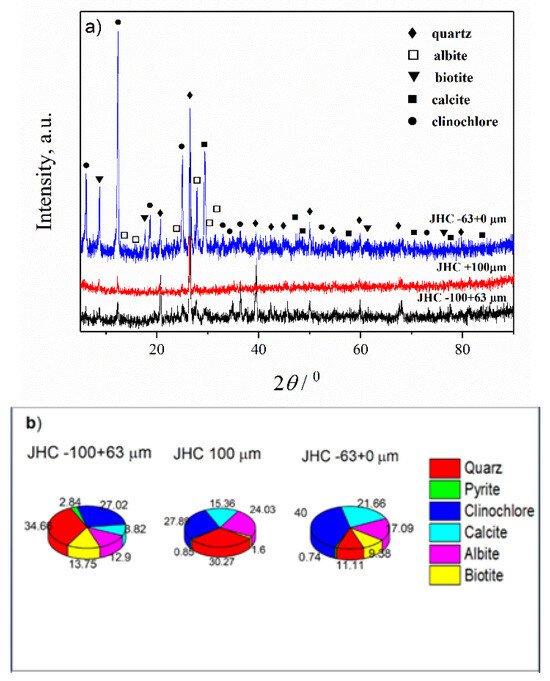 For the JHC sample, fractions 63 + 0, −100 + 63 and −200 + 100 µm were analyzed. As can be seen from the results presented in Table 6, there are no particles in the particle size range +400, −400 + 300 and −300 + 200 µm. The XRD diffractograms are given in Figure 6, while the percentage compositions of fractions and crystal parameters are given in Figure 6 and Table 6 and Table S4. From the obtained results, it can be concluded that the compositions of the different fractions is not uniform and there is a difference in the mineral contents. Also, the composition differs significantly from the starting JHC sample. The highest (~24%) and the lowest (~13%) amounts of albite were determined in fractions −200 + 100 and −100 + 63 µm, respectively. The highest amount of biotite (~14%) was in the fraction −100 + 63 µm, while highest amount of calcite was in the fraction −63 + 0 and −100 + 63 µm. Auxiliary minerals such as quartz and clinochlore were mostly present (more than 50%) in this sample regardless of the particle size and fraction. Considering that, the results presented in Table 6 show that the most prevalent is fraction −63 + 0 µm (91.33%), and it can be concluded that the extraction of useful minerals will be cost-effective from this fraction.