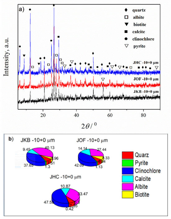 It may be noted from Figure 7 that for all three samples, the changes in phase composition are not uniform in comparison with the starting samples (Figure 2b). All phases in the starting JKB, JOF and JPH samples were detected in this fraction, but in a different relation. For the JKB sample, in the fraction −10 + 0 µm, the contents of the quartz (~8%), calcite (~10%) and pyrite (~1%) were lower, while the content of the biotite (~4%), clinochlore (~38%) and albite (~40%) were higher in comparison with the starting sample. For the JOF sample, the content of the albite, calcite, biotite and pyrite was approximately equal to the content in the starting sample, while the content of quartz (~7%) was lower and clinochlore (~42%) was higher. For the JHC sample, in the fraction −10 + 0 µm, only the content of the albite (~48%) increased, and the content of quartz (~7%) decreased, while the content of other mineral phases was approximately equal as in the starting JHC sample. From the presented results, considering the presence of this fraction (Table 3), it can be concluded that the extraction of useful minerals will be cost-effective from this fraction only in JHC and JOF.