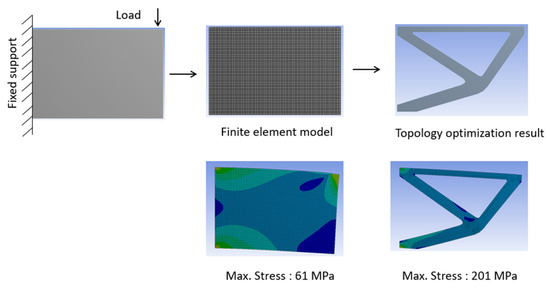 Figure 2 shows an example of a topology optimization application on a cantilever beam. While one end of the cantilever beam was fixed support, a load was applied to the other end. By analyzing the cantilever beam, which was divided into finite elements (meshing), regions with low stress were removed, and the final design was obtained.