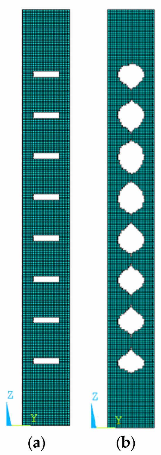 (a) Initial state of the steel profile; (b) optimum opening shapes.