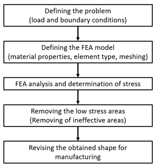 The aim of optimum design is to use less material and prove a more rigid design. In topology optimization, it is aimed at removing inefficient areas, that is, materials with low stress, from the system [16]. Before the optimum design, the boundary and loading conditions of the problem are determined, and then the optimization problem is analyzed. Different objective functions, such as minimizing stress and volume or maximizing stiffness, can be selected depending on structural properties [17]. Topology optimization has been used in many civil engineering problems, such as truss structures, buildings, and reinforced concrete elements [18].