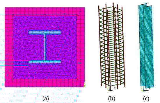 Modeling in ANSYS software: (a) column cross-section; (b) longitudinal and transverse reinforcement; (c) steel profile.