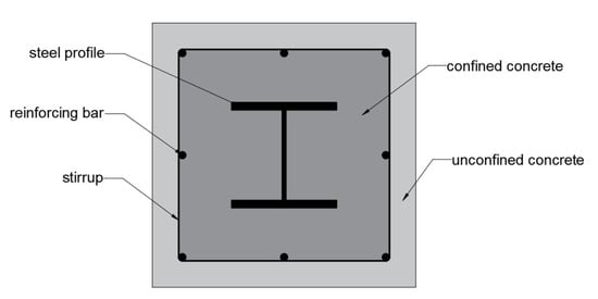Composite elements are designed by combining different materials. The purpose of composite elements is to increase structural performance by combining the advantages of these different materials [1,2]. These elements are preferred in many engineering applications, such as high-rise structures or long-span bridge beams, where high strength is required. The use of composite structural elements reduces the amount of steel by 30% to 50% compared to steel elements and provides a more economical design [3]. In order to increase structural performance, the strength and ductility of the columns used in the building system should be high. Composite columns exhibit less displacement than steel columns because they show more rigid behavior [4]. Although steel columns have high tensile strength and high ductility, they exhibit poor behavior under the influence of pressure. However, in composite columns, the concrete material increases the buckling strength of the steel element [5,6]. In addition, the concrete layer increases the durability of the column by protecting the steel profile from external effects such as corrosion and fire [7,8,9]. Reinforced concrete–steel composite columns generally consist of concrete-encased steel profiles, steel tube sections filled with concrete, and partially encased steel columns.