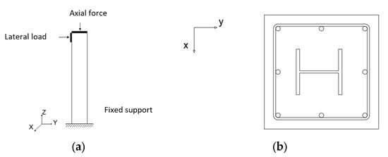 To verify the nonlinear analyses, an experimental study was analyzed in ANSYS APDL software, and then experimental and numerical studies were compared. There is an experimental study in the literature about concrete-encased steel composite columns [7,19]. In the experimental study, the composite column was designed with cross-sectional dimensions of 170 mm × 220 mm and a height of 2 m. The composite column cross-section and the steel profile dimensions used inside are seen in Figure 8a. While the lower end of the composite column was designed as a fixed support, the upper end was loaded (Figure 8b). In the experimental study, material properties were given as follows: concrete strength as 25.4 MPa, steel profile yield strength as 302 MPa, and reinforcement yield strength as 560 MPa (Table 1). Lateral displacement was applied to a composite column until failure. As seen in the graphs, the results obtained by numerical modeling are very close to the experimental results (Figure 9).