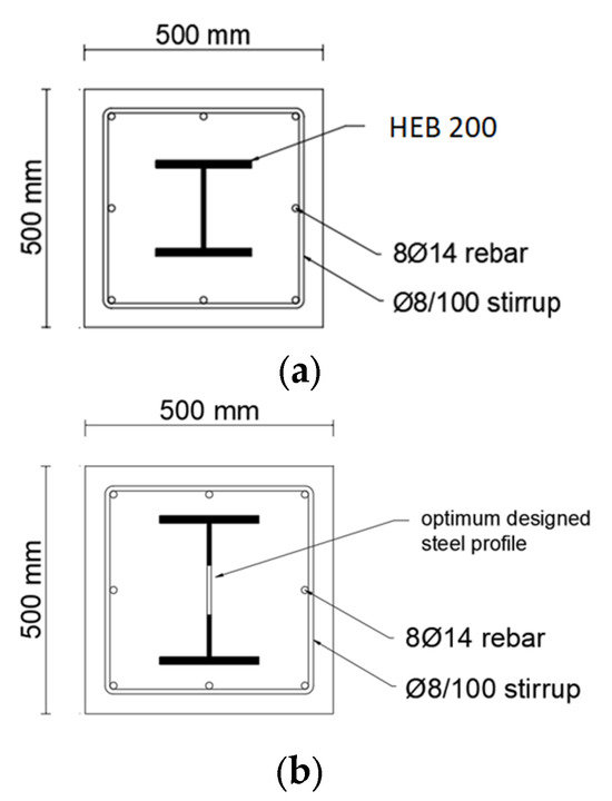 The design of composite columns was made taking into account TBEC-2018 and TSC-2016 regulations. The composite column dimensions were chosen as 500 mm × 500 mm, and the reinforcements are seen in Figure 13. The standard steel profile used in the composite column was chosen as HEB 200 (Figure 13a). After optimum design as a result of topology optimization, the height of the steel profile increased from 200 mm to 300 mm (Figure 13b).