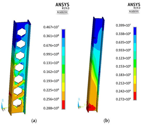 Von Mises stresses of the steel profile in the composite column before failure (unit: N/m2) (a) optimum designed steel profile (b) standard steel profile.