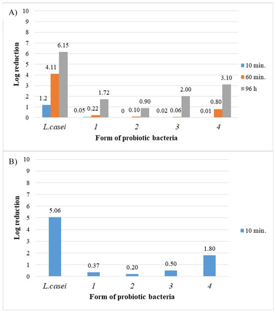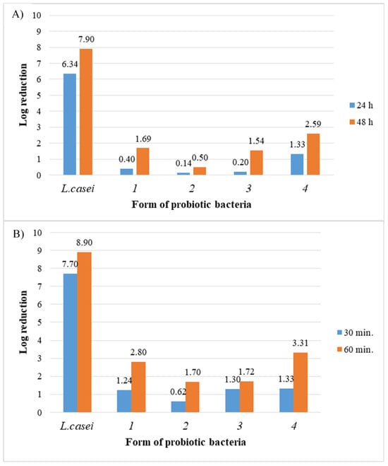 The suspensions of the L. casei strain and the microspheres obtained by centrifugation at different speeds (1, 2 and 3) and microdispersion (4) were subjected to various physicochemical factors, such as a temperature of 40 °C for 10 min, 60 min and 96 h (Figure 1A); a temperature of 50 °C after 10 min (Figure 1B); acidic and alkaline pH (Figure 2); UV radiation for exposure times of 24 h and 48 h (Figure 3A); and preservatives—sodium benzoate combined with sodium salts of levulinic and anisic acid (Figure 3B). A 0.2 mol/L sodium citrate solution with pH = 6 was used for the decapsulation process. The viability of free and encapsulated probiotic cells was assessed by counting bacterial colonies grown on MRS agar plates (incubation conditions: 37 °C, 72 h) after using the pour plate inoculation technique. The obtained results were expressed in log CFU/g. LAB cell reduction was calculated as the difference between the initial number of free LAB cells or LAB cells contained in the microspheres (No) and the number of free LAB cells or LAB cells contained in microspheres exposed to physicochemical agents for a given time (Nt): (No–Nt). In the case of assessing the effect of temperature (Figure 1), the duration of exposure to the free and encapsulated L. casei strain was selected based on trial-and-error analysis, which enabled the observation of visible differences in the survival of the free strain compared with the carriers used. In the case of 50 °C, it was impossible to observe differences over a longer period of time (60 min), because the samples were biodegradable.