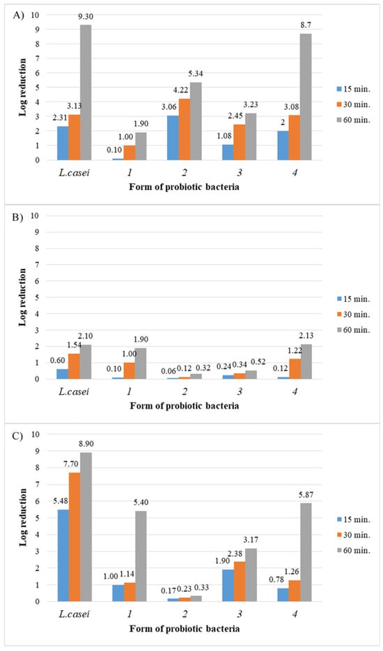 The next parameter assessed was pH, with values of 2.0, 5.5 and 9.0 after contact times of 15 min, 30 min and 60 min. In accordance with the literature [42], acidic and alkaline pH values were selected for testing (Figure 2A,C) in order to assess the positive effect of the carriers used on the probiotic strain. In turn, pH 5.5 (Figure 2B) was chosen due to the fact that it corresponds to the physiological pH of the skin, which is the site of the potential application of the product.