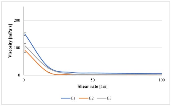 The data presented in Figure 4 indicate that the viscosity of the products decreases with the increase in the shear rate, which is characteristic of non-Newtonian, shear-thinning fluids. The obtained results show that the addition of the active ingredient did not significantly change the viscosity of the composition.