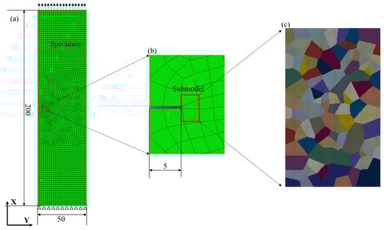 This paper presents a polycrystalline model using Voronoi tessellation [49]. The study utilizes the finite element sub-model technique to investigate the impact of microstructure near the crack tip on crack tip deformation. The sub-model, located in the vicinity of the crack tip, consists of approximately 100 grains with random orientations, as shown in Figure 1. The loading method is determined based on the local displacements obtained from the analytical results of the global model. The validity of this sub-model analysis method has been confirmed in previous literature [50]. Displacements are used as boundary conditions in this paper to ensure a balance of strain energy between the global model and sub-model boundary conditions.