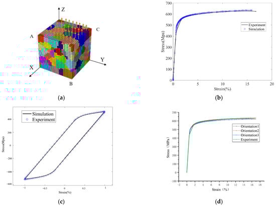 Uniaxial stretching polycrystal model: (a) setting of boundary conditions; (b) comparison between uniaxial tensile test and simulation; (c) comparison of fatigue cyclic loading experiment and simulation; (d) the effect of different grain orientations on the model.