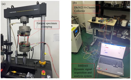 In comparison to the tensile test, the fatigue test involves a grooved specimen. The parameters of the specimen are shown in Figure 3b, where the thickness of the test block is 5 mm. The fatigue test is conducted using an Instron 8801 fatigue tester and the control mode is strain control. The specific fatigue parameters can be found in Table 3. In order to observe changes in surface organization during fatigue, the specimen’s surface is sanded and polished using sandpaper with different mesh sizes (800, 1000, 1200, 1500, 2000, 2500, and 3000). Strain gauges are attached to the notch to monitor strain changes before the initiation of fatigue microcracks. The overall test program is illustrated in Figure 4. For dynamic strain gauge measurements, this paper utilizes the DH3823 8-channel strain collector with a collection frequency of 1 kHz. The experimental setup is shown in Figure 4b.