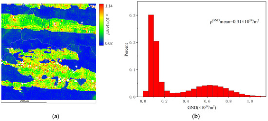 EBSD above the specimen notch when not fatigued: (a) GND; (b) histogram of GND.