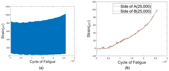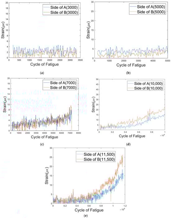 Following the fatigue test program outlined in Section 3.1, this paper fabricated aluminum alloy specimens and subjected them to different numbers of fatigue cycles: 3000, 5000, 7000, 10,000, and 11,500. The fatigue parameters used in the experiments are provided in Table 3. The strain changes on the A and B surfaces were monitored under various fatigue conditions, as shown in Figure 8.