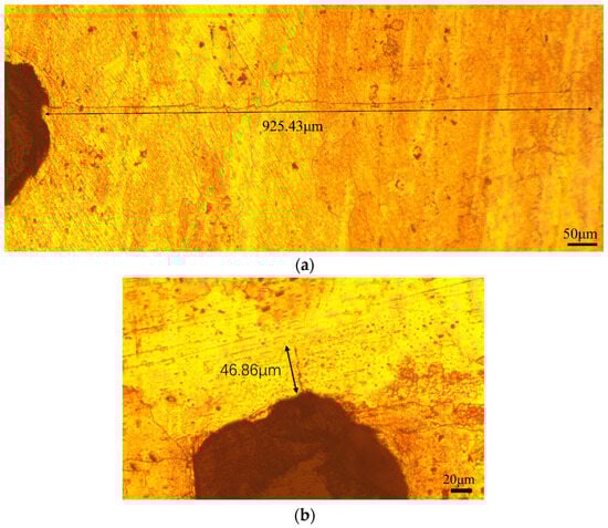 Figure 6 presents the recorded strain changes from resistance strain gauges during fatigue testing of the specimen. The strain data is shown with an envelope above and below it, and the initial value is zeroed as shown in Figure 6b. The results display the strain changes on two surfaces of the specimen, namely surface A and B. At this stage, the cracks have extended to approximately 925 μm. Due to the presence of coarse grains, the main mechanism of crack extension is perforation fracture. Figure 7a illustrates the metallographic image of crack expansion at the notch on the B-side, which corresponds to a strain growth of 100 με. As the cycles progress to around 25,000 cycles, the crack length continues to increase. In order to establish a clearer relationship between fatigue damage and strain, a new batch of test materials was produced to obtain varying fatigue cycles and different strain changes in the fatigue damage test materials. EBSD tests were conducted on the surface to analyze the micro-mechanism of fatigue damage.