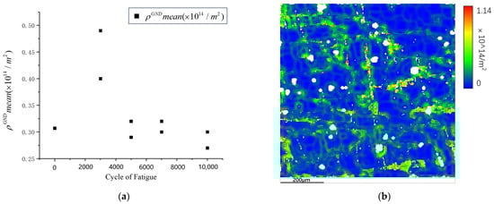 Geometric must dislocation density variation: (a) geometric mean must dislocation density variation; (b) GND at 3000 cycles.