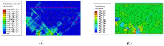 Equivalent plastic strain and strain energy dissipation at the fortieth cycle for a strain amplitude of 0.3%: (a) equivalent plastic strain; (b) strain energy dissipation.