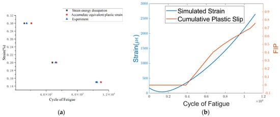 Simulation results analysis: (a) comparison of two FIP predictions and experimental results; (b) variation of strain and FIP with fatigue cycles for crystal plasticity model at 0.15% strain amplitude.