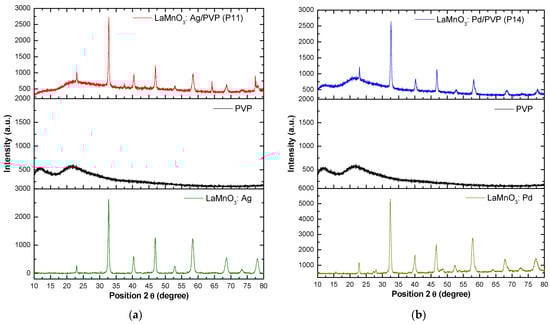 XRD patterns for the precursors and hybrid materials: (a) LaMnO3:Ag, PVP, and LaMnO3:Ag/PVP (P11); (b) LaMnO3:Pd, PVP, and LaMnO3:Pd/PVP (P14).