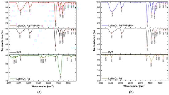 The FT-IR spectra of the precursors and hybrid materials: (a) LaMnO3:Ag, PVP, and LaMnO3:Ag/PVP (P11); (b) LaMnO3:Pd, PVP, and LaMnO3:Pd/PVP (P14).