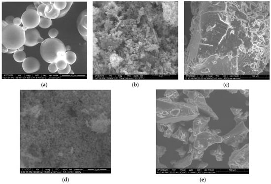 SEM images for (a) PVP; (b) LaMnO3:Ag; (c) LaMnO3:Ag/PVP (P11), (d) LaMnO3:Pd, and (e) LaMnO3:Pd/PVP (P14).