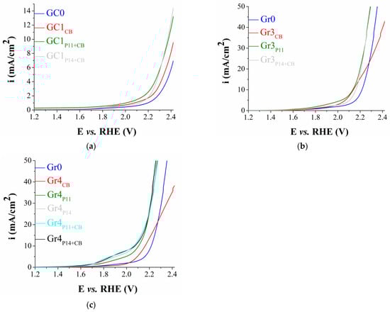The linear voltammograms shown in Figure 4c were traced on the unmodified graphite electrode and on the samples modified according to Procedure 4. Perovskite-containing electrodes exhibited higher OER electrocatalytic activity compared with Gr0 and the Carbon Black-only modified graphite sample (Gr4CB). At i = 10 mA/cm2 ηOER = 0.875 V for Gr4P11, 0.84 V for Gr4P14 and Gr4P14+CB, and 0.83 for Gr4P11+CB. At higher i values, it is observed that the polarization curves are very close to each other and in some cases even overlap.
