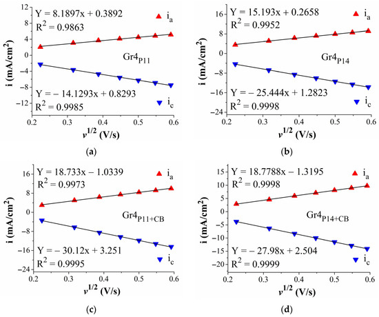 The graphical representation of the dependence between the peak current densities of the anodic and cathodic peaks corresponding to the ferrocyanide/ferricyanide redox couple and the square root of the scan rate for the Gr4P11 (a), Gr4P14 (b), Gr4P11+CB (c), and Gr4P14+CB (d) electrodes.