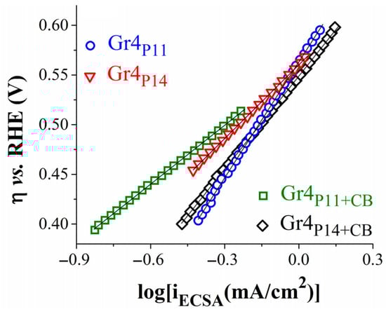 The Tafel plots were obtained for the O2 evolution reaction on the Gr4P11, Gr4P14, Gr4P11+CB, and Gr4P14+CB electrodes, in 1 M KOH solution.