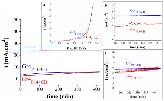 The electrochemical stability of the four electrodes was evaluated during 7 h chronoamperometric tests at the constant potential value corresponding to i = 5 mA/cm2. Gr4P11+CB was revealed to be more stable than the other investigated samples. The i vs. time curves recorded for this electrode and for Gr4P14+CB are presented in Figure 7. In the case of Gr4P11+CB, the i value stabilized at 5.8 mA/cm2. LSVs were obtained on this sample before and after the experiment and the results can be seen in Inset a. At higher i values the two polarization curves overlap almost perfectly, but this is not the case at values < 24 mA/cm2 where the stability test led to a decrease in the OER activity of the electrode. For example, at i = 10 mA/cm2 ηOER = 0.88 V. This 50 mV increase is probably due to the high electrochemical potential applied throughout the chronoamperometric study. Still, the Gr4P11+CB electrode was more electrochemically stable than the other samples. To exemplify this, the i vs. time curve recorded under the same conditions but for Gr4P14+CB is also included in Figure 7. Apparently, the behavior of the two samples is not very different, but a closer look at the amperogram (Insets b and c) reveals the presence of features attributable to intense alternate processes of O2 bubble accumulation and release that are not observed on the curve traced on Gr4P11+CB [29]. More importantly, once the test ended and the surface of the sample was investigated visually it was observed that the perovskite-containing composition was partially detached from the graphite surface it was deposited on during the manufacturing process.
