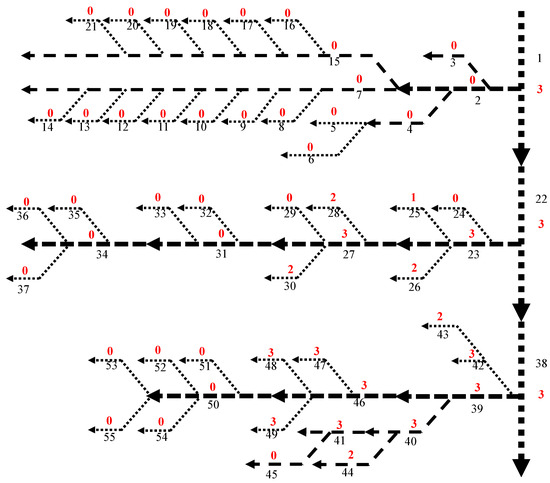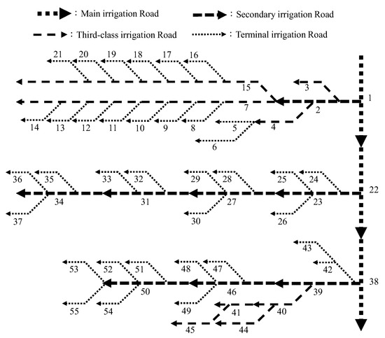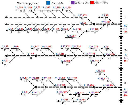 Suppose the target region contains a total of n areas. We use n bits to represent each solution. If one bit is 0, irrigation to the corresponding area has been stopped. If not, then water is still supplied. Note that upstream–downstream continuity is considered during the production of the initial solutions and in their crossover and mutation with subsequent chromosomes. The water supply must also fall within the set range.