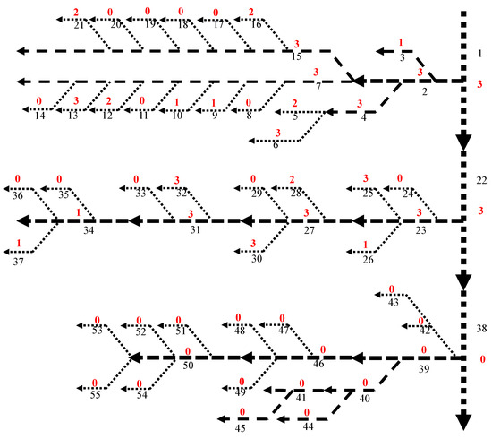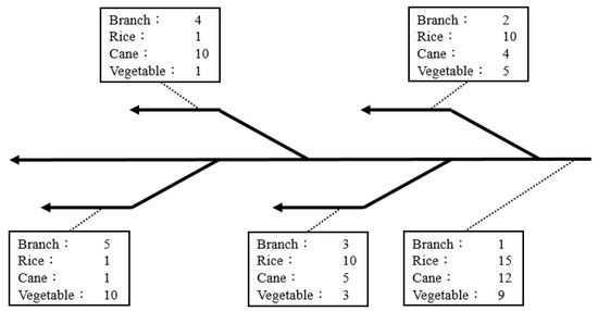 The datasets used in our experiments come from the Jhuoshuei River irrigated region in the Chiayi-Tainan Plain of Taiwan. We chose this region because it is the largest agricultural area in Taiwan, with the highest agricultural yield and the largest number of irrigation canals. The target region has a total of 55 irrigation branches that belong to three major branch systems. The relationships between them are shown in Figure 1. The data formats for each branch and the relationships between them are presented in Appendix A (Table A1, Table A2 and Table A3). The black text presents the numbers of the branches, and the thickness of the lines represents the width of the branches. According to the irrigation data of 2017 provided by the Yunlin Management Office of the Irrigation Agency, the main crops in this irrigation area are rice, sugar cane, and vegetables, with total cultivation areas of 2926.456 has, 5568.742 has, and 1893.242 has, respectively. The total yield per hectare of the three types of crops was 5776 kg, 47,836 kg, and 18,367 kg, respectively, and their daily standard water demand was 183.6, 44.2, and 52.41 m3, respectively. Their farm prices per kilogram were NTD (new Taiwan dollar) 22.13, 0.96, and 28.78, and the government ultimately set the compensation amounts per hectare for the three types of crops at NTD 93,000, 82,000, and 75,440. Most papers use data from multiple years to ensure the accuracy of the objective values; however, as the focus of the current paper is the methodology of filtering solutions and not the accuracy of prediction, we use data from only a single year. We verify the proposed approach by measuring its performance in selecting a small set of solutions among many. Performance is, thus, related to the number of solutions and not the amount of input data.