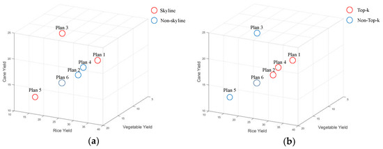 To apply a top-k query, we must first integrate multiple objective values into a single value, as shown in the summary column of Table 1. The top three solutions are Solutions 1, 2, and 4. However, these solutions only rank the highest for rice yield; all objective values in Solutions 2 and 4 are poorer than those in Solution 1, as shown in Figure 3b. The best solutions for cane yield (i.e., Plan 3) and vegetable yield (i.e., Plan 5) are not selected. These results, thus, lack the validity of those presented in Table 1. This example represents a classic shortcoming of the top-k query: only one among conflicting solutions is selected, as the weights of different objective values are not adjusted well. In contrast, the skyline query can find a set of solutions in which all objective values are optimized by at least one solution.