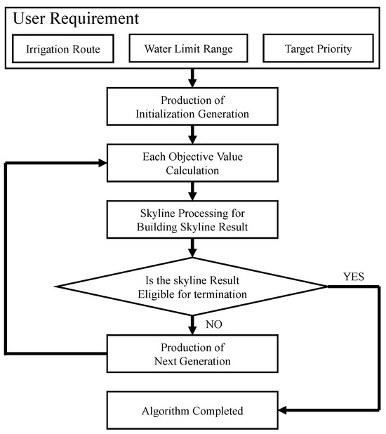 Figure 4 presents a flow chart of the proposed algorithm. First, the user designates the areas that the system must consider in the target region and the total water resources that can be used and ranks each decision objective. The system, then, randomly generates the first generation of possible solutions and begins the process of generation evolution. At the beginning of each generation, the system performs a skyline query: the target of the query is the union set of all of the solutions in this generation and the temporary skyline solutions identified from previous generations. Next, the system regards these query results as the temporary skyline solutions of this generation and calculates the fitness scores of each solution. Based on these fitness scores, the system, then, performs crossover and mutation operations to produce the next generation of solutions. When the system has evolved to the number of generations set by the user, it regards the temporary skyline solutions of this generation as the final results. As there may be many solutions, the system arranges them based on the provided ranking [59,60].
